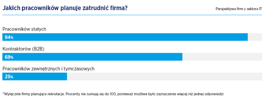 Wysokie zapotrzebowanie na ekspertów IT znajduje odzwierciedlenie w badaniu Hays Technology, przeprowadzanym na koniec 2021 roku. Specjalizacja IT znajduje się na szczycie listy rekrutacji zaplanowanych przez firmy na rok 2022. Co więcej, rekordowo, bo aż 99 proc. organizacji działających w branży technologicznej planuje rekrutacje na najbliższych dwanaście miesięcy. Mimo że poszukiwania najczęściej będą dotyczyć pracowników etatowych, to aż 69 proc. firm przewiduje podjęcie współpracy z kontraktorami IT, świadczącymi usługi w ramach umowy B2B.