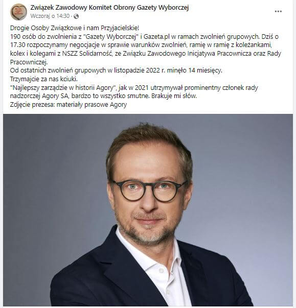“Niecały miesiąc temu zapowiadaliśmy spotkanie z Zarządem. Chcieliśmy zapytać, czy planowane czy zwolnienia i czy jest szansa na wyrównania inflacyjne, po cichu licząc, że będziemy mówić raczej o tym drugim. Wstępnie umówiliśmy się na spotkanie po 13 stycznia. Wtorkowy komunikat giełdowy był jak uderzenie obuchem. Agora SA powiadomiła, że planuje zwolnić do 190 osób z ‘Wyborczej’ i Gazety.pl. We wtorek odbyło się pierwsze spotkanie Zarządu ze związkami. Miało charakter techniczny: ustalaliśmy terminy i składy zespołów negocjacyjnych” – napisała na Facebooku Solidarność Agora SA – związek zawodowy.
