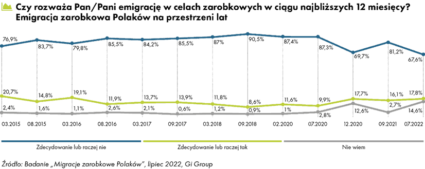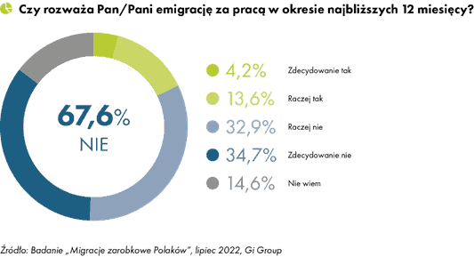 Odsetek rozważających emigrację zarobkową utrzymuje się na wysokim poziomie od 2020 roku. W porównaniu z rokiem ubiegłym wzrósł on z 16,1 proc. do 17,8 proc. Jednocześnie mniej Polaków opowiada się za pozostaniem w kraju – w 2021 roku odsetek nierozważających emigrację wynosił 81,2 proc., a w bieżącym jest to 67,6 proc. Badanie ARC Rynek i Opinia na zlecenie Gi Group wskazuje na znaczący wzrost wśród osób niezdecydowanych – z 2,7 proc. do aż 14,6 proc.