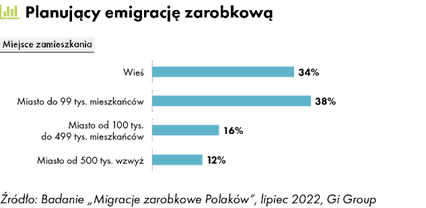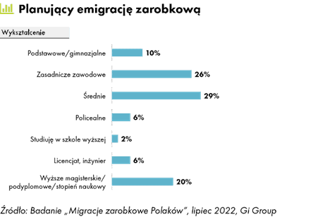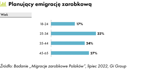 Wśród planujących wyjazd w celach zarobkowych są najczęściej osoby w wieku 25-44 (56 proc.), z czego większą liczbę stanowią młodsi w wieku 25-34 (32 proc.), z wykształceniem średnim (29 proc.) i zawodowym (26 proc.). Nieco mniejszy odsetek stanowią osoby z wykształceniem wyższym (20 proc.). Gotowość do wyjazdu deklaruje więcej mężczyzn niż kobiet (60 proc. vs 40 proc.). Są to głównie mieszkańcy mniejszych miast i wsi, osoby z regionów północno-zachodniego (23 proc.), wschodniego (17 proc.), północnego i centralnego (po 16 proc.), w mniejszym stopniu natomiast z regionu południowo-zachodniego (9 proc.) oraz województwa mazowieckiego (6 proc.).