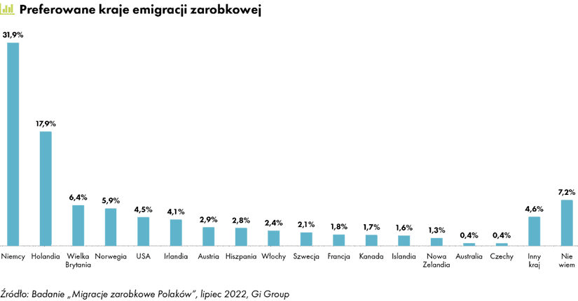 Od wielu lat to Niemcy są najczęściej wybieranym kierunkiem emigracji zarobkowej Polaków. W lipcu br. wskazało je 31,9 proc. osób rozważających wyjazd. Na drugim miejscu znalazła się Holandia ze wzrostem zainteresowania z 15,8 proc. w 2021 roku do 17,9 proc. w roku bieżącym, a następnie Wielka Brytania (ze znacznym spadkiem z 9,4 proc. w ubiegłym roku do obecnych 6,4 proc.) oraz Norwegia (5,9 proc.). 7,2 proc. badanych nie wie, do jakiego kraju chciałoby wyjechać.