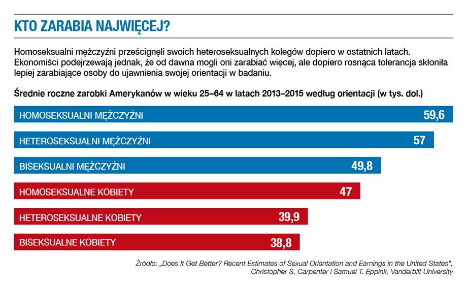 To więcej niż PKB Niemiec. – podaje Forbes. Naukowcy z Uniwersytetu Vanderbilta, którzy przeanalizowali dane z badania National Health Interview Survey z lat 2013–2015, odkryli, że amerykańscy homoseksualiści zarabiają obecnie o jakieś 10 proc. więcej od swoich heteroseksualnych kolegów na podobnych stanowiskach.