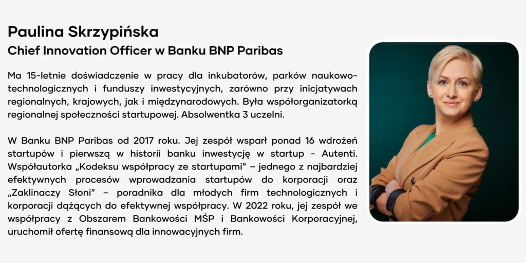 W Banku BNP Paribas, jak mówi Paulina Skrzypińska, od samego początku traktują młode innowacyjne firmy jako partnerów, a także jako priorytetowych Klientów. To m.in. dzięki współpracy z Migam, mogą sprawnie obsługiwać Klientów Głuchych, zaś dzięki współpracy z Autenti (w które ponownie zainwestowali) skutecznie depapieryzują bank i umożliwiają klientom zdalne i bezpieczne podpisywanie dokumentów online, bez konieczności wizyty w oddziale przy okazji wielu procesów. Ponadto, jako jedyny bank w Polsce, mamy dedykowanych doradców do obsługi finansów firm innowacyjnych oraz politykę kredytową, która pozwala nam je wspierać, także finansowo – podkreśla.