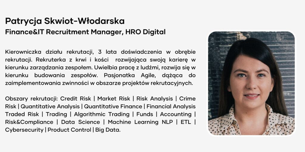 Podkreśla, że rekruter/rekruterka z tego obszaru musi być ciągle świadoma, jak ważne jest poszerzanie spektrum swoich umiejętności. Dodaje, że zespół, którym zarządza jest na bieżąco z FinTechowymi nowinkami, śledzi trendy związane z nowymi technologiami, aby w partnerskich relacjach wspierać klientów, dla których pozyskują pracowników.