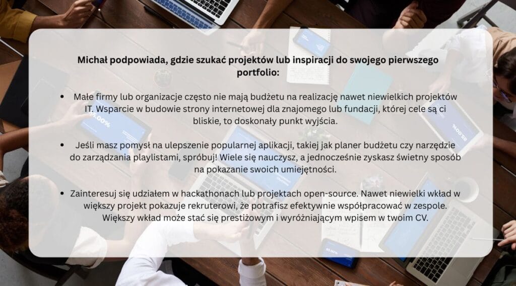 To wsparcie okazało się bezcenne, zwłaszcza na etapie tworzenia portfolio – jej przyszłej wizytówki. Jak podkreśla Michał Kwarciak, koordynator zatrudnienia w Mate academy, jest ono najważniejszym dowodem umiejętności kandydata.