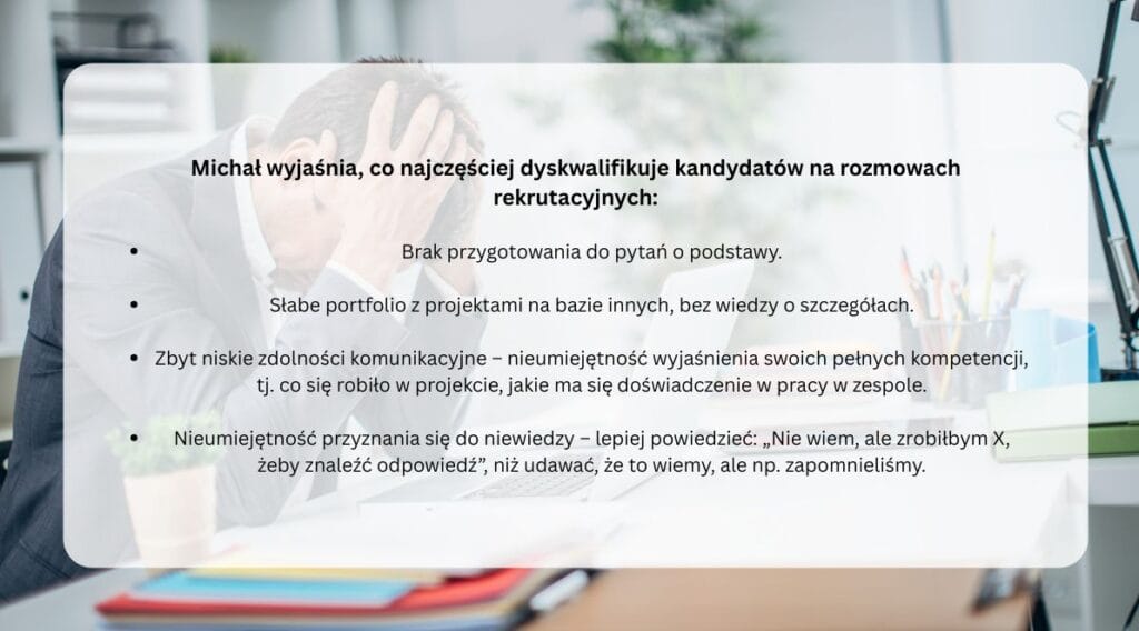 “Warto przeglądać aktywnie portale z ofertami pracy, takie jak JustJoinIT czy NoFluffJobs, i aplikować na stanowiska wymagające roku lub dwóch lat doświadczenia. Dobre portfolio często niweluje tę różnicę” – dodaje.