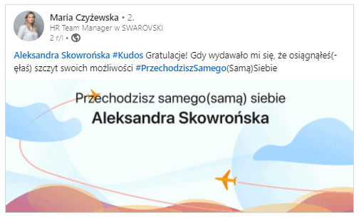 Dobrym tego przykładem jest firma Swarovski, w której Maria Czyżewska, HR Manager publicznie chwali członka zespołu. Jest to zapewne wynik sukcesu, bądź proaktywnej postawy opisywanej osoby.