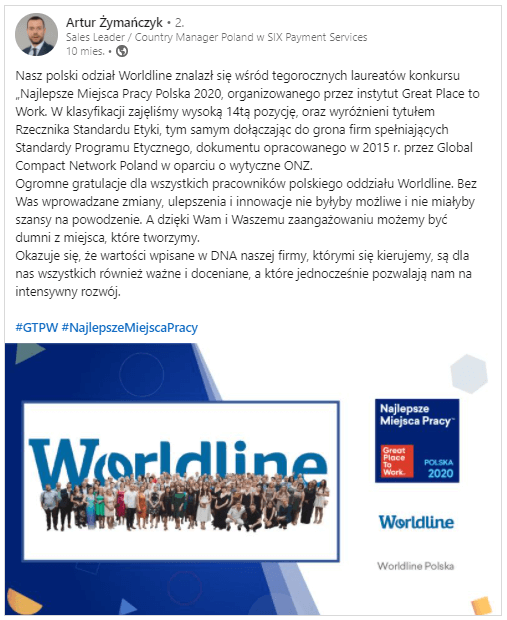 Podczas gdy firma Six Payments, znalazła się wśród laureatów konkursu „Najlepsze Miejsce Pracy Polska 2020” nie umknęło to uwadze pracowników i taka informacja znalazła się chociażby na profilu Artura Żymańczyka.