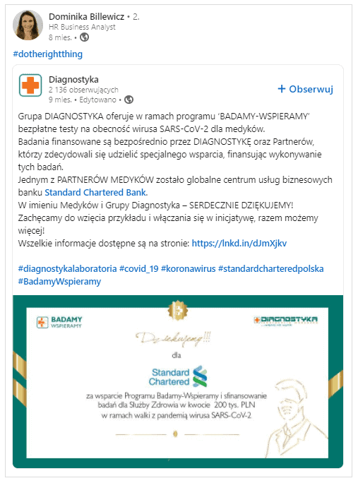 Dla pracowników Standard Chartered bardzo ważna okazała się gotowość wsparcia finansowego wykonywanych testów na obecność covid-19 dla medyków. W dobie pandemii działania dobroczynne nabierają innego znaczenia. Taka postawa również została przez Dominikię Billewicz doceniona poprzez post na portalu Linkedin.