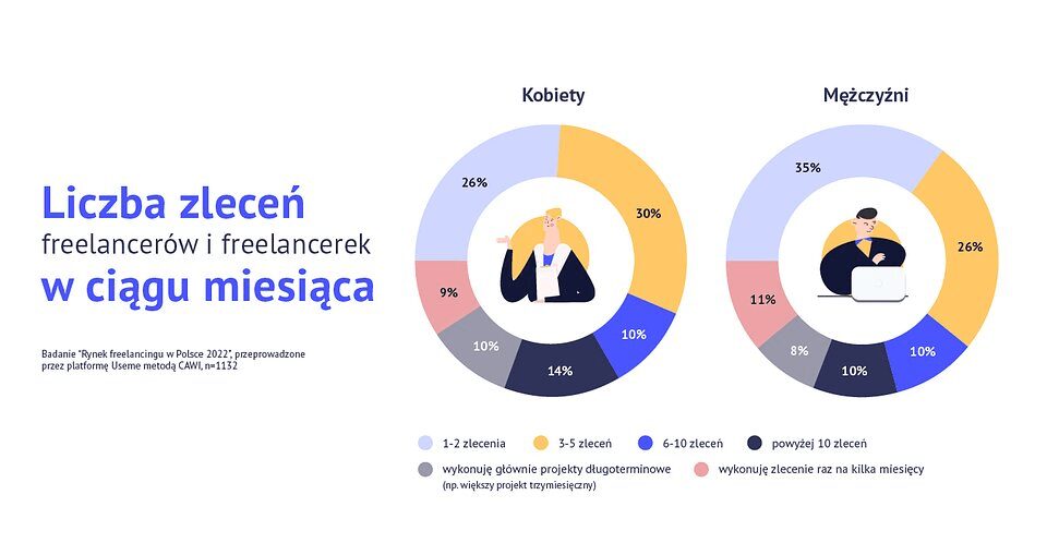 Materiał powstał na podstawie raportów “Freelancing w Polsce: zarobki, inflacja i pokolenie Y na rynku pracy” oraz “Raport Useme – branże freelancingu w Polsce” opracowanych przez Useme.com w maju 2022 roku, na próbie 1132 polskich freelancerów. Badanie rynku freelancingu w Polsce realizowane jest corocznie od 2014 roku.