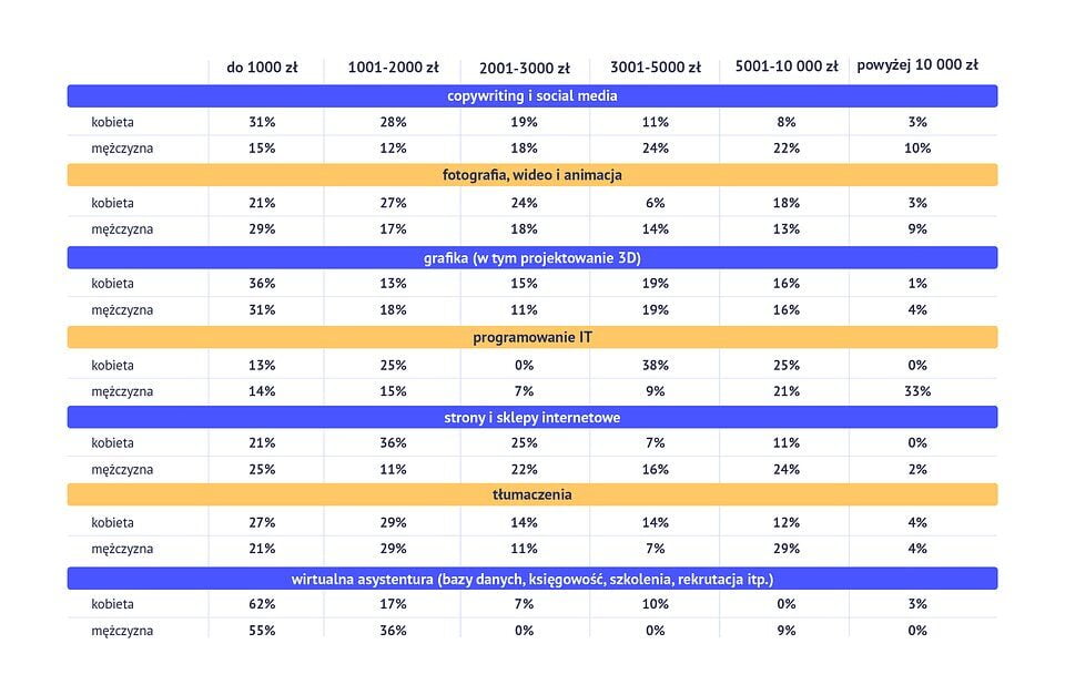 Wirtualna asystentura to stanowisko, które wciąż zyskuje na popularności. Ta mocno sfeminizowana branża jest jedyną, w której wyraźnie widoczna jest również finansowa dominacja kobiet. Niskie dochody rozkładają się podobnie między obie płcie, ale dysproporcja uwidacznia się wraz ze wzrostem wynagrodzenia – 10 proc. ankietowanych freelancerek zadeklarowało zarobki od 3 tys. zł do 5 tys. zł, a 3 proc. osiąga dochody powyżej 10 tys. złotych miesięcznie.