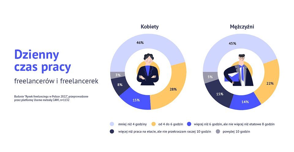 Podobieństwa możemy zaobserwować również w kontekście ilości czasu, jaką specjaliści i specjalistki poświęcają w ciągu dnia na pracę zdalną. Różnice możemy zaobserwować tylko w przedziale najbardziej zapracowanych, czyli osób, które poświęcają na freelancing więcej, niż wymaga praca na etacie, ale mniej niż 10 godzin dziennie. W tej grupie wyraźnie dominują mężczyźni – 18 proc. ankietowanych w porównaniu do 8 proc. biorących udział w badaniu kobiet.