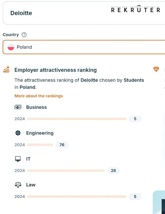 Globally, Universum’s “World’s Most Attractive Employers 2023” report put Deloitte in 6th place (Business) and 14th (IT) among students — indicating a strong international brand. Deloitte Poland also won employer-branding awards.