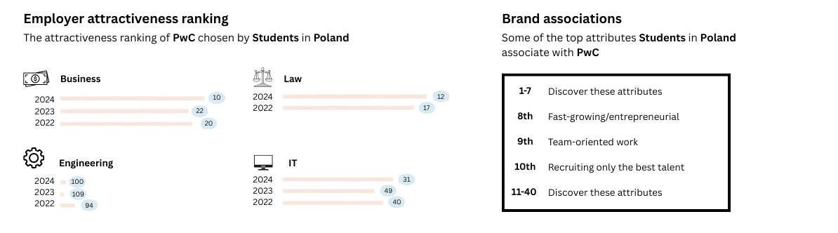 Per some of the top attributes Polish students associate with PwC, according to the 2024 Universum survey, fast-growing/entrepreneurial, team-oriented work, and recruiting only the best talent ranked 8th, 9th and 10th, respectively.