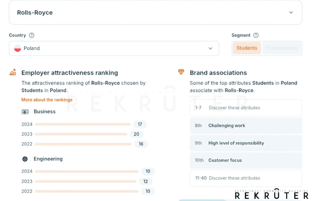 2024 Universum results for Poland show a pattern that is clear: Rolls-Royce ranks as a solid mid-tier choice among engineering and business students, but isn’t the most attractive employer.