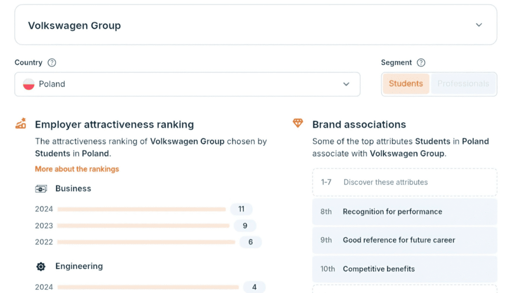These programs have earned VW Poznań industry accolades: it was certified a Top Employer Poland in 2025 for its HR practices, and its multi‑generational workforce (from VW’s founding era to today) is cited as a strength in company communications. Even Universum’s Global student survey last year ranked VW Group #11 and #4 in the Business and Engineering categories, respectively, with students citing “recognition of performance, good reference for future career” and “competitive benefits” as Volkswagen’s top attributes.