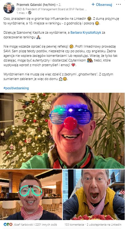Świadomość social mediów w Polsce, jak i na świecie jest obecnie bardzo wysoka. Jednak, aby pozytywnie wpływać na swoich obserwatorów, nie wystarczy tylko regularnie wrzucać treści do sieci. To, na co zwracają dziś uwagę użytkownicy w internecie, jest autentyczność. Rosnąca skala dezinformacji, fake newsów, czy phishingu (oszustwo internetowe), sprawia, że internauci stają się nieufni w stosunku do treści. Być może właśnie dlatego m.in. Przemek Gdański, prezes BNP Paribas, cieszy się tak sporym zainteresowaniem na swoim koncie na Linkedin. Jego profil obecnie zrzesza 30 tysięcy obserwatorów, w tym kilkanaście tysięcy reakcji przy publikowaniu jednego posta raz na 1-2 tygodnie.