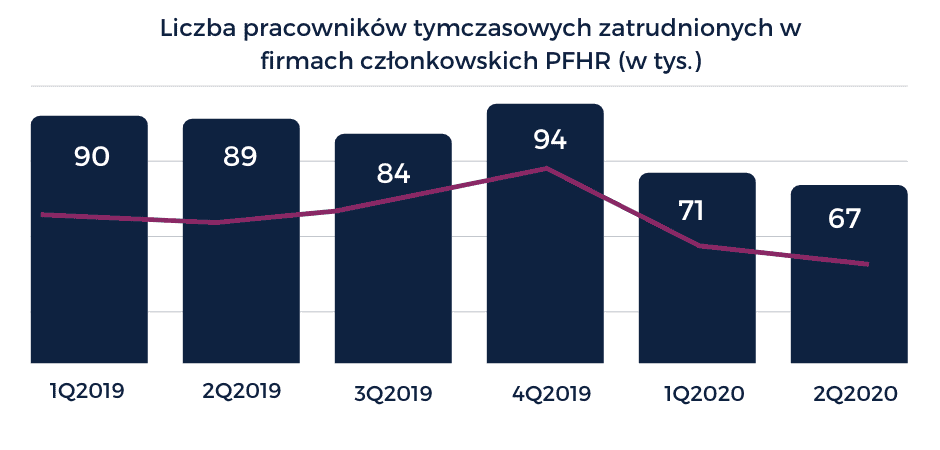 O 25%, w porównaniu do tego samego okresu poprzedniego roku, zmniejszyła się liczba pracowników tymczasowych. Porównując dane kwartał do kwartału, spadek ten nie jest już tak drastyczny i wynosi 5%, niestety towarzyszy mu znaczny, bo 25%-wy, spadek liczby godzin przepracowanych przez tych pracowników. W sumie, w drugim kwartale firmy członkowskie PFHR zatrudniały 67 tys. pracowników tymczasowych. Ilość przepracowanych godzin w przeliczeniu na pełne etaty wyniosła 27 tys. W Polskim Forum HR, mimo trudnej sytuacji na rynku, nadal udaje się zachować wysoki odsetek umów o pracę zawieranych z pracownikami tymczasowymi, w 2Q2020 wyniósł on 89%.