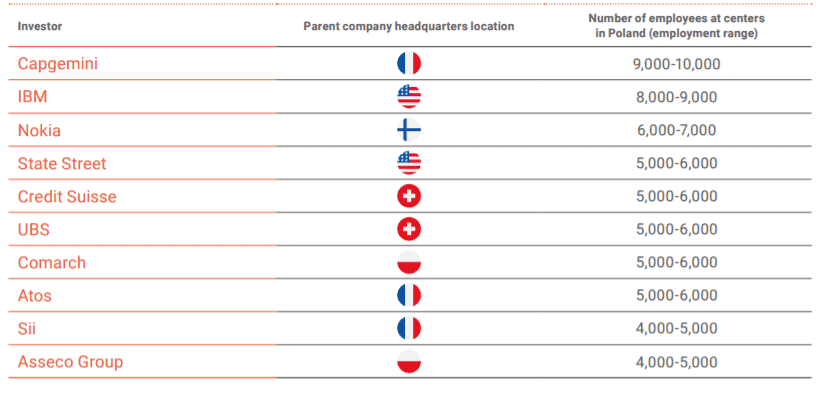 10 największych inwestorów w sektorze nowoczesnych usług biznesowych w Polsce pod względem wielkości zatrudnienia w centrach usług BPO, SSC/GBS, IT, R&D