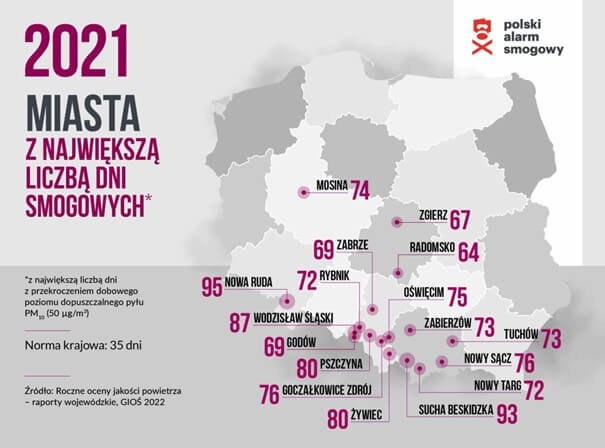 Polski Alarm Smogowy co roku publikuje rankingi najbardziej zanieczyszczonhych miejscowości w Polsce. Obecnie najnowszym raportem jest wciąż publikacja podsumowująca 2021 rok, która zawiera dane przedstawiane przez Główny Inspektorat Ochrony Środowiska.