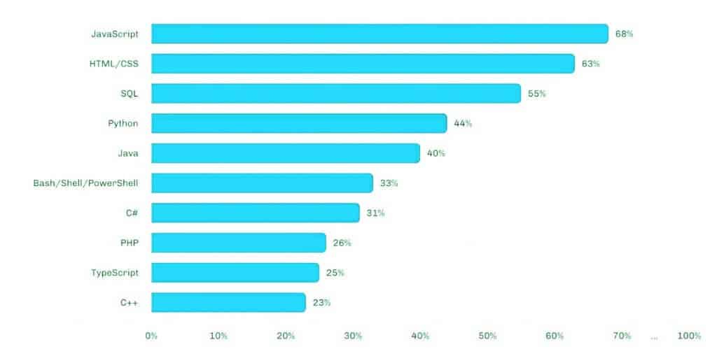 W badaniu Stack Overflow 2020 wzięło udział 65 tys. programistów z całego świata. Według raportu najczęściej stosowanym przez nich językiem programowania jest JavaScript. Pracuje na nim aż 68 proc. respondentów. Uchodzi on za najlepszy przy tworzeniu aplikacji webowych, rozwiązań chmurowych oraz aplikacji IoT. Kolejnym popularnym językiem jest HTML/CSS z wynikiem 63 proc. używane głównie do tworzenia serwisów internetowych. Na trzecim miejscu znalazł się SQL (55 proc.) wykorzystywany do kreowania baz danych i przeprowadzania na nich operacji.