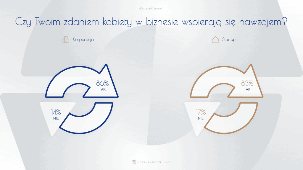 W wywiadach strong women często podkreślają znaczenie wsparcia ze strony współpracowników, w tym mężczyzn, stanowiących zdecydowaną większość, zwłaszcza na wczesnych etapach kariery. Niezależnie od powyższego, kobiety sukcesu widzą przyszłość we wzajemnym wspieraniu się i siostrzeństwie. Respondentki wykazują wyjątkową zgodność w tej materii – w obu grupach aż ponad 80% z nich uważa, że kobiety w branży wspierają się nawzajem, a wsparcie dla innych deklarują prawie wszystkie ankietowane (ponad 90%). Obserwujemy w tym względzie wyraźną tendencję wzrostową w stosunku do poprzedniej edycji badania (w 2019 takie wsparcie deklarowało odpowiednio ponad trzy czwarte reprezentantek startupów i około połowa przedstawicielek korporacji).