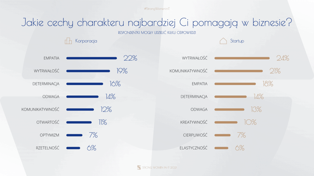 Jako pożądane cechy charakteru w tej branży ankietowane, podobnie zresztą jak w 2019, najczęściej wymieniały empatię (wzrost znaczenia empatii w przywództwie sygnalizuje coraz więcej światowych badań), konsekwencję w działaniu oraz umiejętności interpersonalne. Na uwagę zaskakuje fakt, że w 2021 empatia częściej przewija się w wypowiedziach przedstawicielek korporacji, podczas, gdy na umiejętności interpersonalne i komunikatywność stawiały głównie przedstawicielki startupów. Rozbieżność pomiędzy obiema grupami ankietowanych zapewne jest pokłosiem pandemii, którą naznaczony był ostatni rok. W startupach przestrzeń dla empatii była ograniczona, gdyż niewielkie i młode biznesy odczuły nowe realia wyjątkowo dotkliwie i były skupione na przetrwaniu.