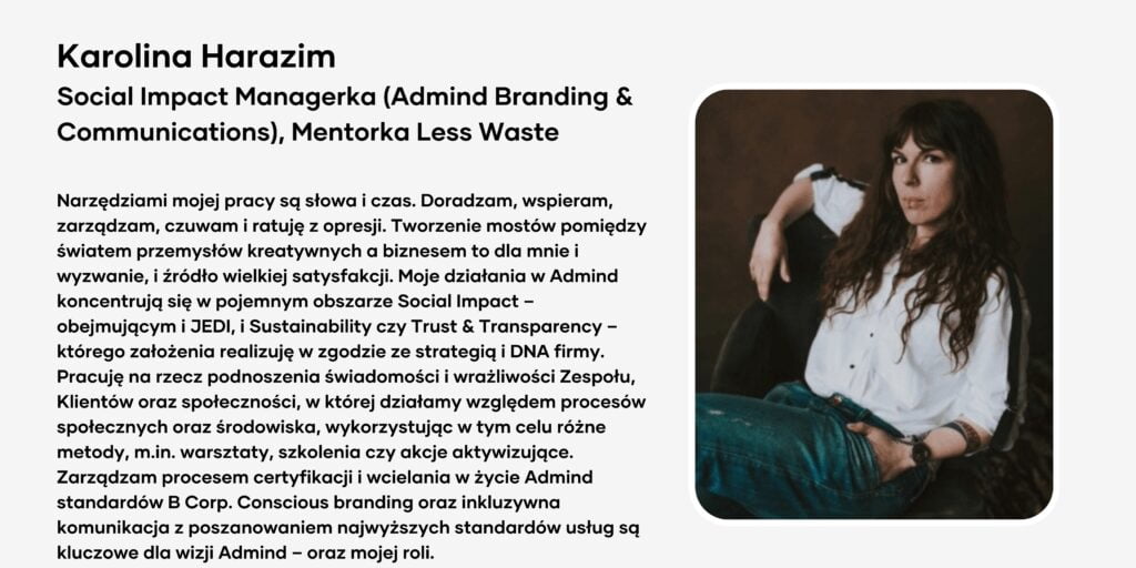 Z radością mogłam ogłosić niedawno, że Admind uzyskał certyfikat B Corp – to globalny ruch łączący biznesy działające na rzecz wspólnego dobra i lepszej przyszłości. Dogłębny i szeroko zakrojony audyt pozwolił nam dołączyć do grona ponad 5000 firm na całym świecie (w tym tak ikonicznych jak Patagonia, Ben & Jerry’s, Aesop czy Camper), które wspólnie działają na rzecz transparentności i lepszych praktyk w biznesie. To duże osiągnięcie. Równocześnie mamy świadomość, że na polskim rynku dołączamy do pionierów, jesteśmy dopiero siódmą rodzimą firmą i pierwszą w branży, która pomyślnie przeszła ten trudny proces oceny. To powód do dumy, ale i tym większe zobowiązanie – chcemy wspierać kolejne ubiegające się o certyfikat firmy w naszym kraju.