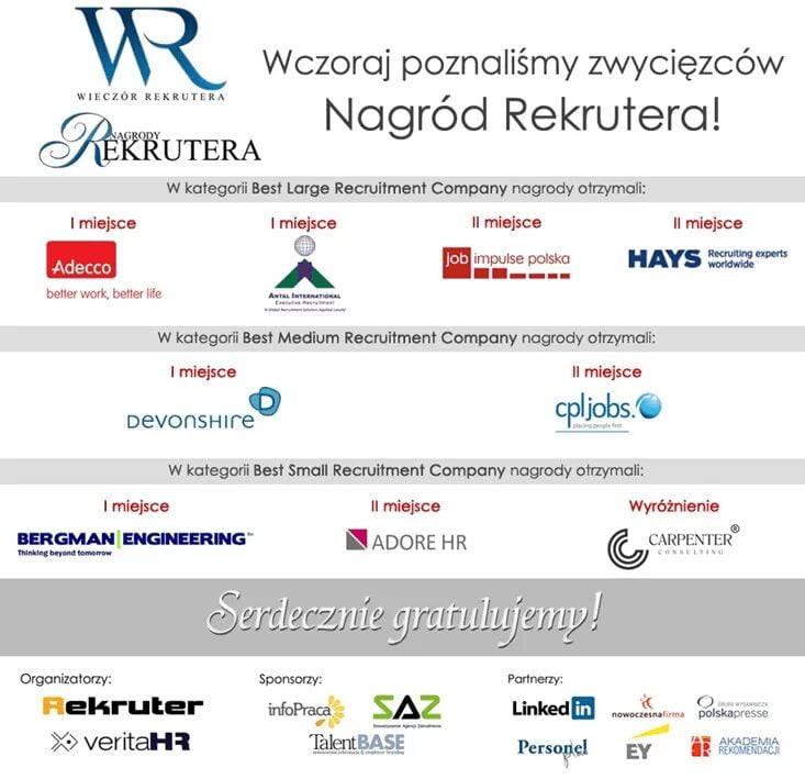 Jednym z powodów, dla których Verita HR zdecydowała się na “neutralność”, był rosnący sukces Wieczoru Rekrutera, polskiego wydarzenia branży rekrutacyjnej. Verita HR włożyła wiele wysiłku w to, aby w Polsce odbyła się trwała i zrównoważona ceremonia wręczenia nagród dla branży rekrutacyjnej. Zwłaszcza że nie ma podobnego wydarzenia, które realnie reprezentowałby dziesiątki tysięcy specjalistów ds. rekrutacji w dzisiejszej Polsce.