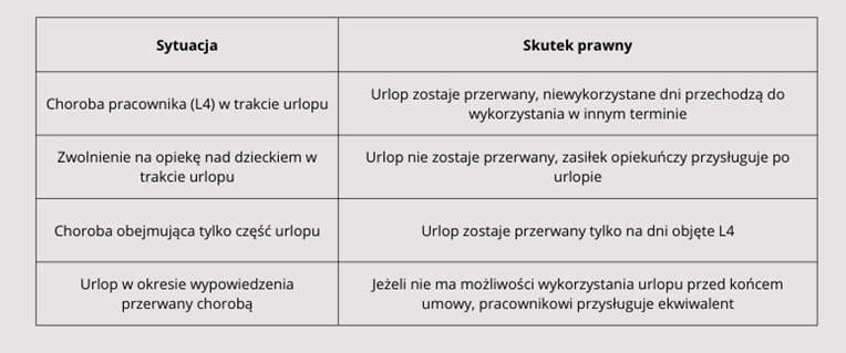 Trzeba jednak podkreślić, że zasada ta odnosi się wyłącznie do sytuacji, gdy pracownik jest niezdolny do pracy z powodu własnej choroby. Jeżeli zwolnienie lekarskie dotyczy opieki nad dzieckiem lub innym członkiem rodziny, urlop nie zostaje przerwany.