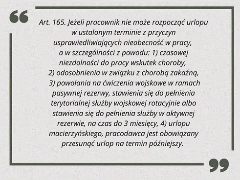 Zgodnie z art. 165 Kodeksu pracy, pracodawca ma obowiązek przesunąć termin urlopu, jeżeli przed jego rozpoczęciem wystąpią określone przeszkody. Natomiast art. 166 Kodeksu pracy reguluje sytuację, w której przeszkody te przerywają urlop pracowniczy.
