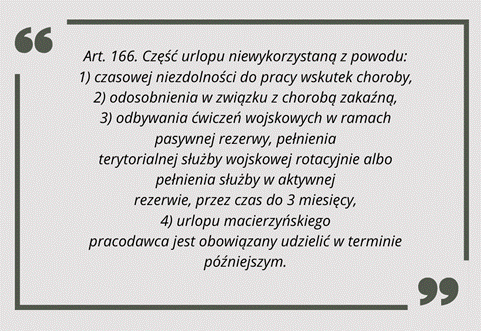 Nas interesuje art. 166, a z jego treści jasno wynika, że urlop ulega przerwaniu w przypadku czasowej niezdolności do pracy z powodu choroby, odosobnienia w związku z chorobą zakaźną, powołania do służby wojskowej lub macierzyństwa. Oznacza to, że jeśli pracownik w trakcie urlopu zachoruje i otrzyma L4, to choroba przerywa urlop, a pracodawca musi udzielić niewykorzystanej części w innym terminie.