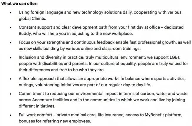 Ciekawym przykładem jest Accenture, która bardzo otwarcie komunikuje jakie grupy społeczne wspiera i jakie podejmuje działania w tym zakresie. Co najciekawsze firma robi to już na etapie oferty pracy.