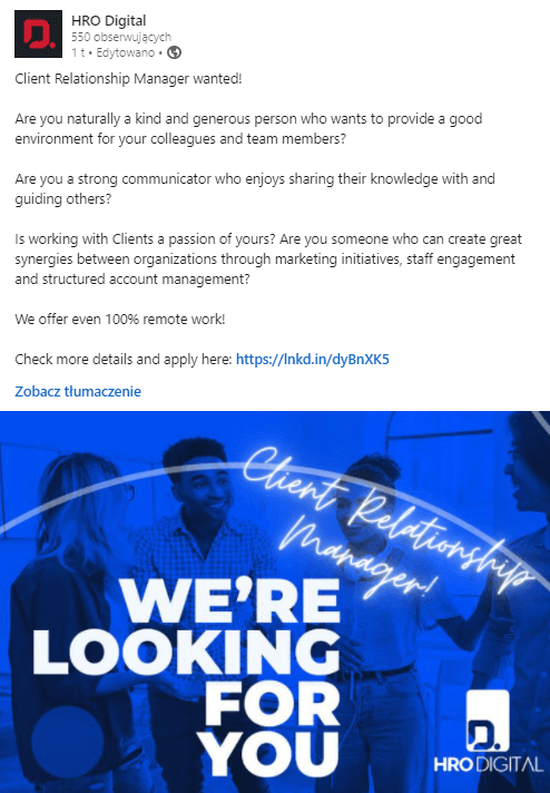 Dobrym przykładem firmy, która oferuje nawet w 100% pracę zdalną w swoich ogłoszeniach jest HRO Digital.