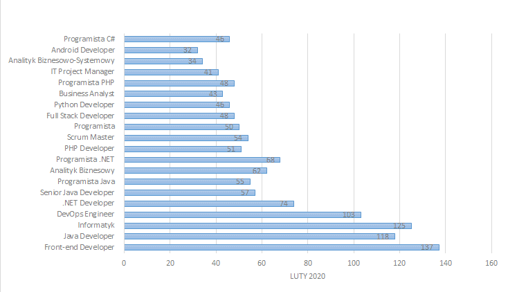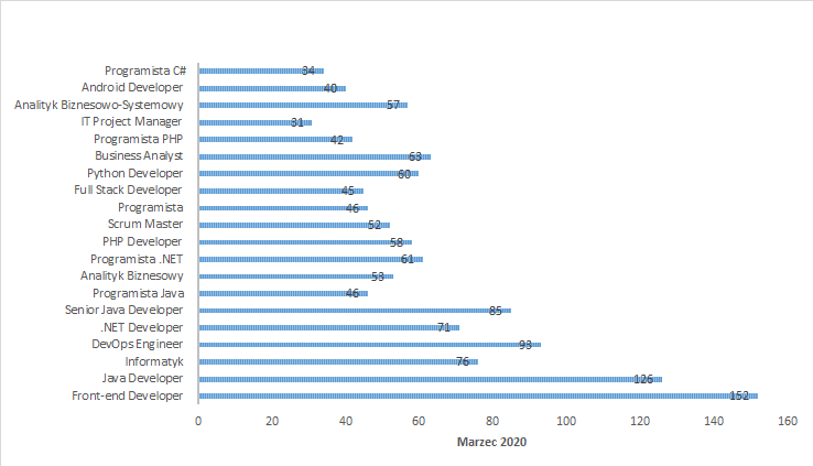 Widzimy, że na przestrzeni 3 miesięcy swoją pozycję mocno trzymał front-end developer i tych ofert pracy pojawiało się najwięcej. W marcu było ich nawet więcej w porównaniu do lutego.