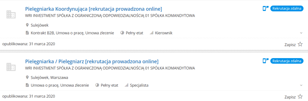 W serwisie pracuj.pl na hasło “pielęgniarka” znaleźliśmy około 60 opublikowanych ofert o pracę. Nie brakuje w nich także adnotacji o możliwości rekrutacji online.