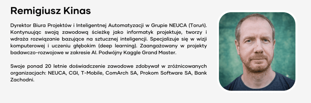 Remigiusz Kinas, Dyrektor Biura Projektów i Inteligentnej Automatyzacji, Grupa NEUCA: Z wykształcenia jestem informatykiem. Studiowałem dawno temu tzw. komputerowe systemy wspomagania decyzji. To właśnie w tamtych czasach zaczęły pojawiać się pierwsze publikacje dotyczące głębokich sieci neuronowych (obszar sztucznej inteligencji). W powszechnym natomiast użyciu były systemy ekspertowe. To w nich upatrywano możliwości wsparcia człowieka w podejmowaniu decyzji. Informatykę wybrałem ze względu na moje zamiłowanie do matematyki oraz logiki. Z perspektywy wielu lat uważam, że był to trafny wybór mimo, że przez wiele lat pracowałem na tzw. styku pomiędzy IT a biznesem.