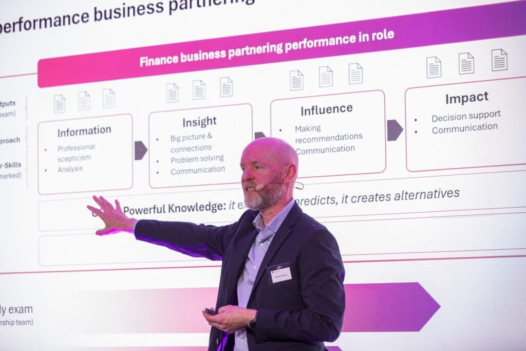 Następnie Stephen Flatman, M.Ed., Vice President of Education and Professional Qualifications, Management Accounting, AICPA & CIMA, przedstawił szczegóły aktualizacji Kwalifikacji Profesjonalnej CGMA. Nowy sylabus rozwija kompetencje w obszarach finansowego partnerstwa biznesowego, analitycznego myślenia, strategicznego planowania, zrównoważonego rozwoju i nowoczesnych technologii finansowych – odpowiadając na potrzeby zmieniającego się świata.