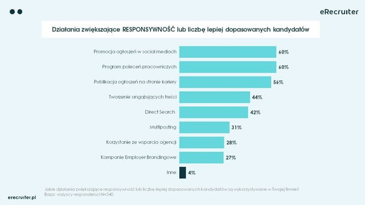 i efektywna współpraca z innymi pracownikami zaangażowanymi w projekty rekrutacyjne. Znaczenie ma także dobór narzędzi i rozwiązań, które wspierają rekrutera w jego codziennej pracy i docieraniu do grupy docelowej. Aby zwiększyć skuteczność oferty i liczbę dopasowanych do niej kandydatów, rekruterzy – poza opublikowaniem treści w tzw. job boardzie – podejmują dodatkowe aktywności. Aż 60% respondentów dba o promocję ogłoszeń w social mediach. Taki sam odsetek badanych sięga po programy poleceń pracowniczych. Ponad połowa (56%) korzysta z zakładki Kariera na firmowej stronie, mając świadomość, że dla kandydatów jest to cenne źródło wiedzy o firmie.