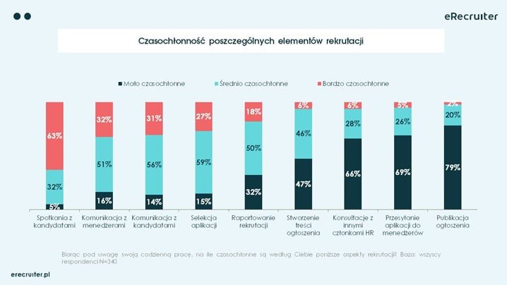 Z badania eRecruiter wynika, że to czynnik ludzki odgrywa decydującą rolę w kontekście długości procesu rekrutacyjnego. Ponad 60% respondentów twierdzi, że najbardziej czasochłonnym etapem rekrutacji są spotkania z kandydatami. Na kolejnych miejscach znalazły się: komunikacja z menedżerami, komunikacja
