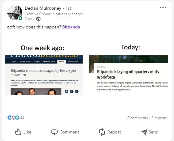 In a somewhat disturbing story, the news of layoffs within Bitpanda hit some employees by surprise. On Friday the 24th of June Sifted posted a story about Bitpanda cutting a third of its workforce. The problem was that allegedly many of these employees heard about it first… from Sifted. And not from their line managers or HR department at BitPanda. Not an ideal situation for any employer.