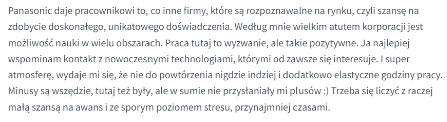 Firma Panasonic oferuje studentom elastyczne godziny pracy, wynagrodzenie według stawki godzinowej oraz możliwość uczestniczenia w ciekawych projektach. Warunkiem jest dyspozycyjność przez co najmniej 12 miesięcy, co pozwala na zdobycie rzeczywistego doświadczenia zawodowego.