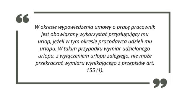 W okresie wypowiedzenia pracodawca może zobowiązać pracownika do wykorzystania przysługującego mu urlopu. Kodeks pracy wskazuje również, że w tym czasie wymiar urlopu jest ograniczony. Liczba dni urlopu udzielonego w okresie wypowiedzenia, z wyłączeniem urlopu zaległego, nie może przekroczyć proporcjonalnego wymiaru wynikającego z art. 155(1) Kodeksu pracy. W praktyce oznacza to, że w przypadku urlopu za niepełny rok kalendarzowy stosuje się odpowiednie przeliczenie, a należny urlop naliczany jest proporcjonalnie do okresu zatrudnienia.