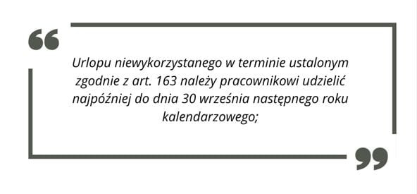 Urlop niewykorzystany w danym roku kalendarzowym powinien zostać udzielony najpóźniej do 30 września roku następnego. Jeśli nie zostanie wykorzystany do tego terminu, nie przepada ani z chwilą ustania stosunku pracy, ani z dniem 30 września. Pracownik zachowuje pełne prawo do takiego urlopu, a pracodawca jest zobowiązany do wypłaty ekwiwalentu pieniężnego na tych samych zasadach, co w przypadku urlopu bieżącego.