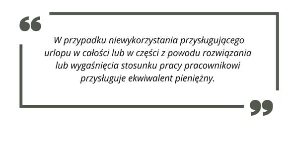 - Urlop niewykorzystany w naturze podlega ekwiwalentowi pieniężnemu – art. 171 §1 Kodeksu pracy.