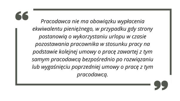 Jest jedna sytuacja kiedy, po zakończeniu umowy pracodawca nie musi wypłacać ekwiwalentu za niewykorzystany urlop. Mówimy tu o sytuacji w której, pracownik kończy jedną umowę o pracę i od razu podpisuje kolejną z tym samym pracodawcą. W takiej sytuacji niewykorzystany urlop przechodzi na nową umowę i może zostać wykorzystany w naturze, o czym mówi art. 171 Kodeksu Pracy:
